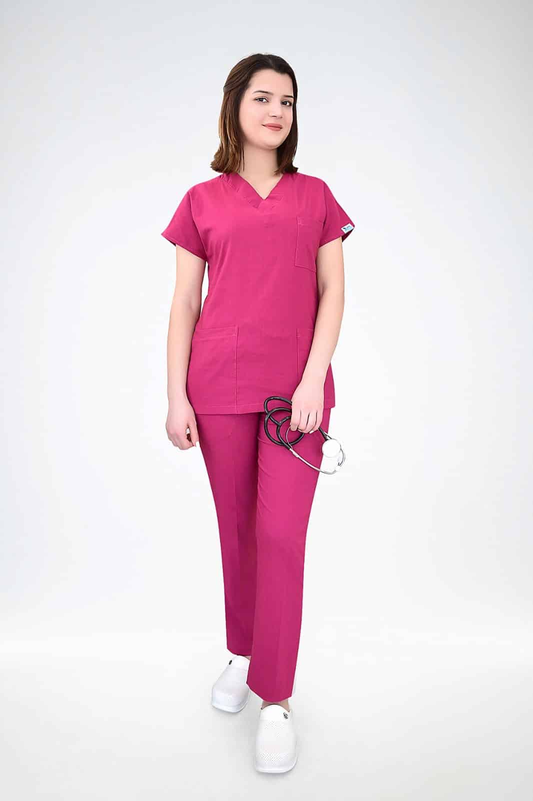 ალუბლისფერი ელასტიური უნისექსი ლიკრას სამედიცინო უნიფორმის ნაკრები ექიმისა და ექთნისთვის
