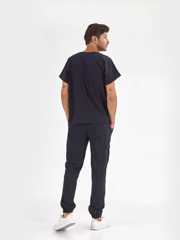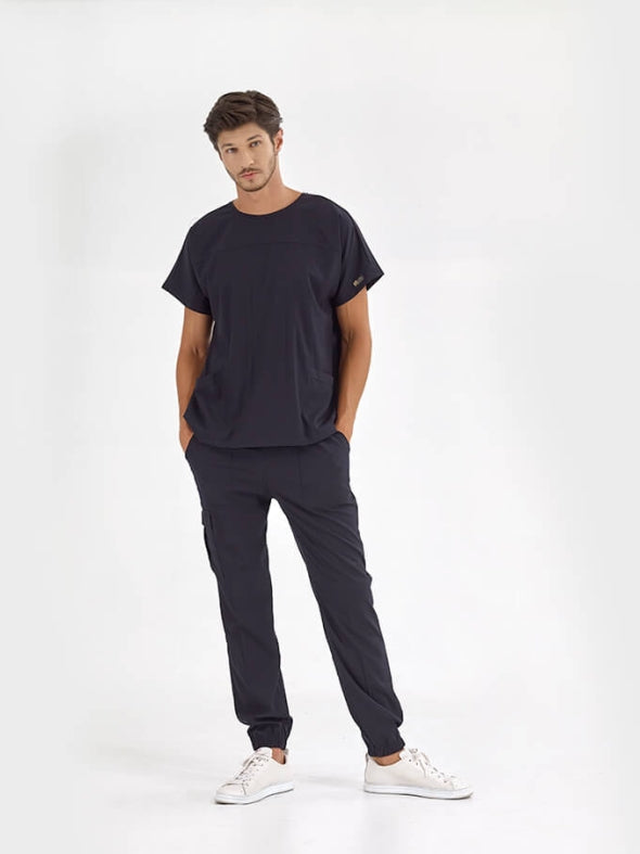 მუქი ლურჯი ჯოგერის სტილის სამედიცინო კომპლექტი ექიმისთვის, ექთნისთვის, ფუფხიანი ქსოვილისგან, ლუქს კლასი