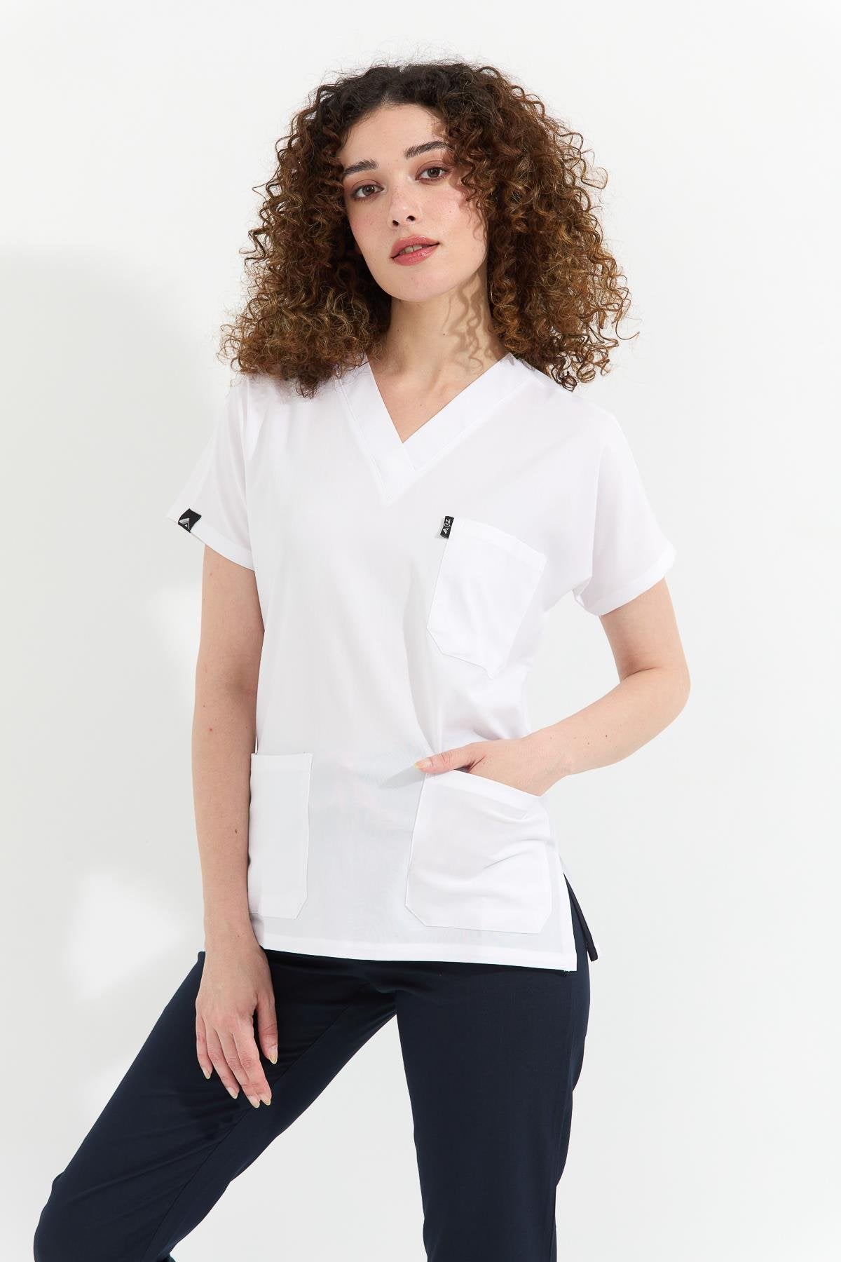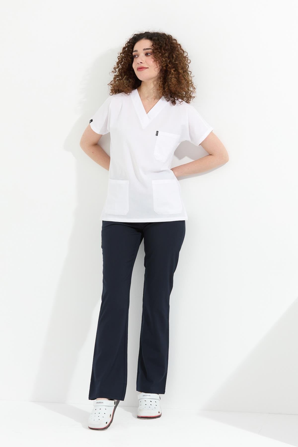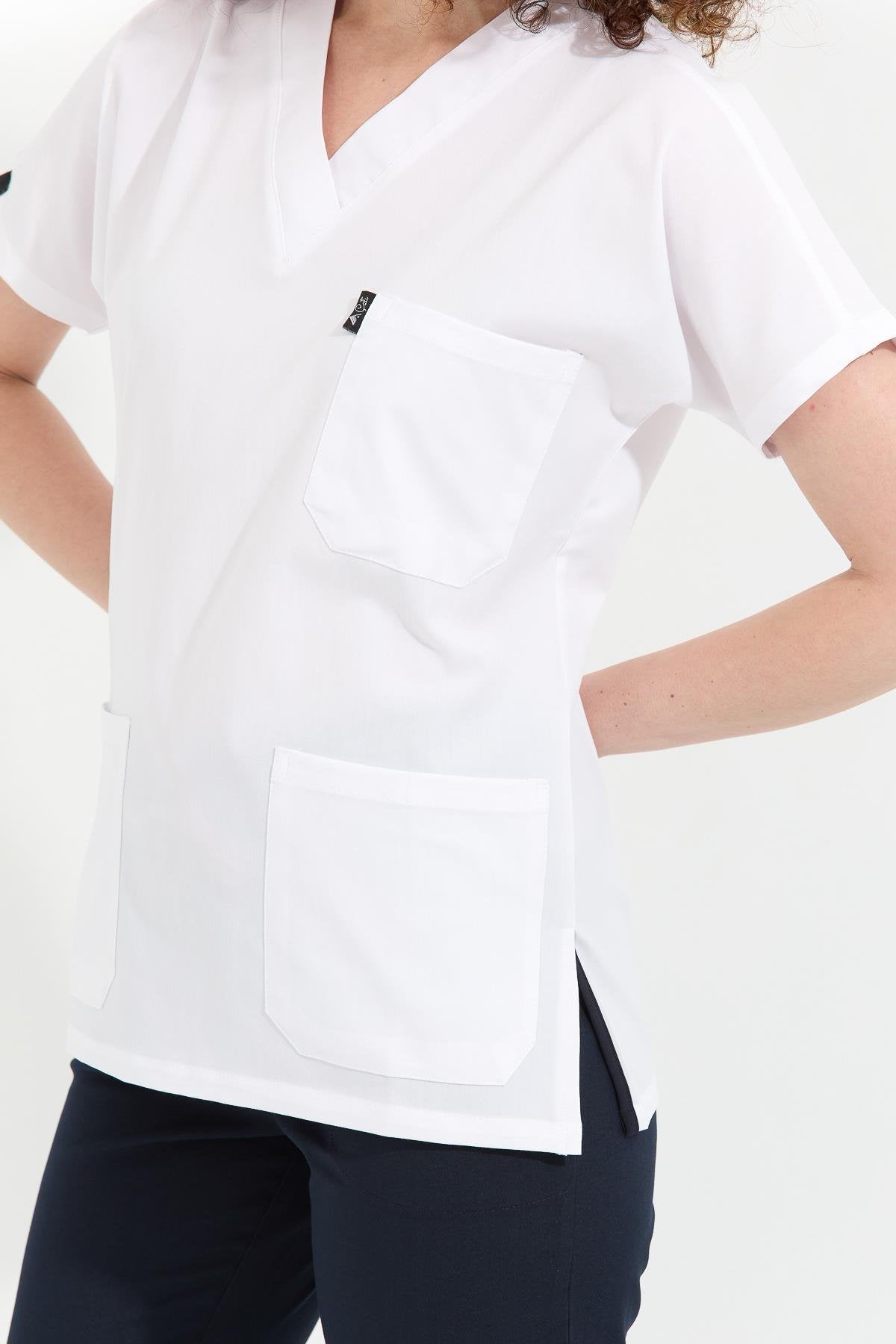 - ლიკრას სამედიცინო უნიფორმის სეტი V-მაგრით შედგება ორი ნაწილისგან: ზედა და ქვედა ნაწილისგან.მაისურს აქვს ერთი პატარა და ორი დიდი ჯიბე.