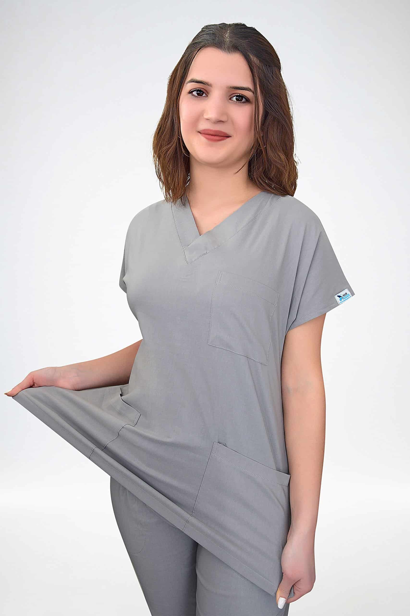 • Dr. Greys-ის მოდელის ექთნის უნიფორმა ელასტიკური სტრუქტურისაა, რადგან ის ლიკრასგანაა დამზადებული.• ექიმის უნიფორმას აქვს ფრინველის ფრთისებრი სახელოები, ამიტომ ის არ ეწებება სხეულს და დისკომფორტს არ იწვევს.