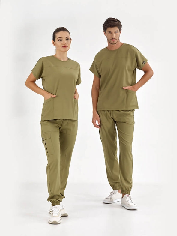 ხაკის ფერის საბაზისო სამედიცინო სკრაბების ნაკრები ექიმისთვის, ექთნისთვის, ფუფუნებილი ლაიკრას ქსოვილისგან